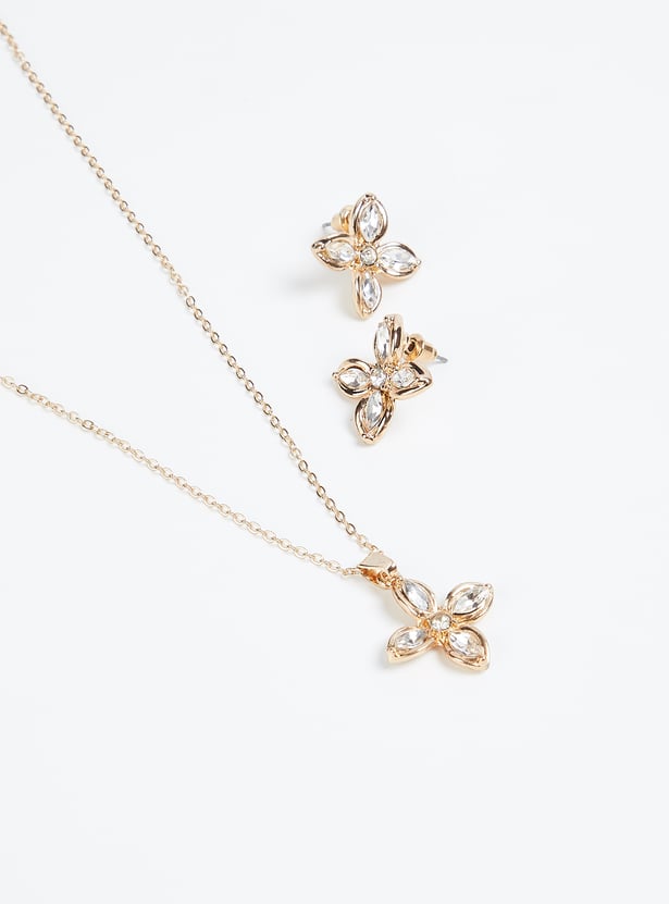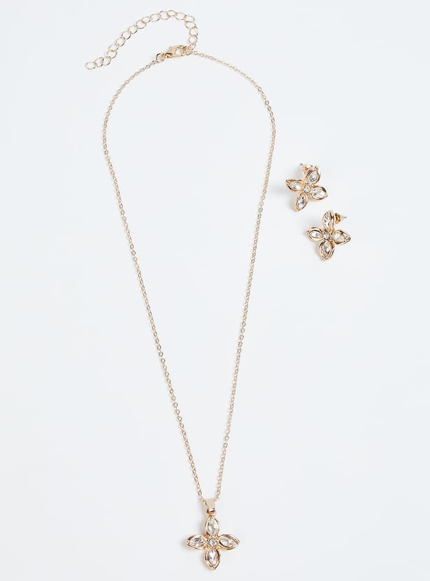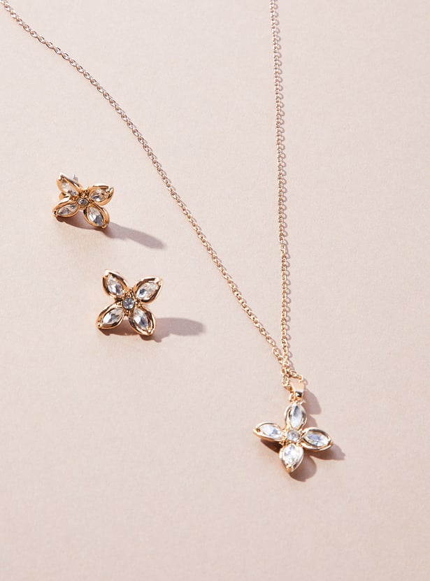 Complete your look with this elegant floral necklace set. The set features a delicate floral chain with a charming pendant, secured with a lobster closure. Paired with matching earrings that have a post and back closure, this set adds a feminine and graceful touch to any outfit.