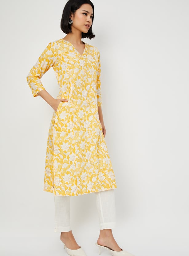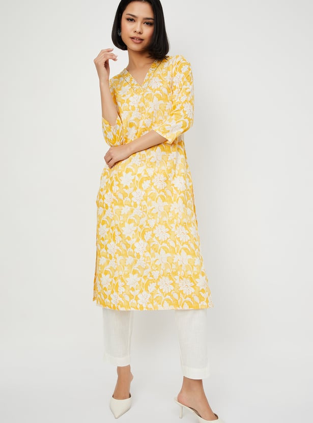 Elevate your style with this floral printed straight kurta set. The kurta features a v-neck, 3/4th sleeves, side pocket, and side slits, while the straight pants with an elasticated waist offer comfort and ease. Perfect for casual or semi-formal occasions.