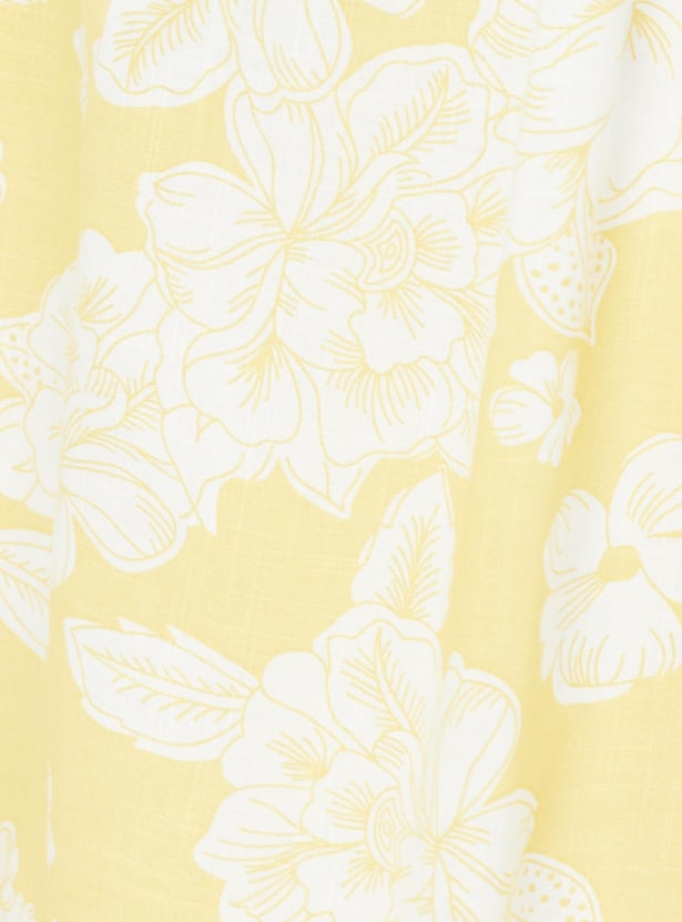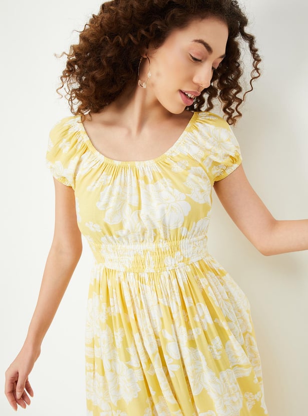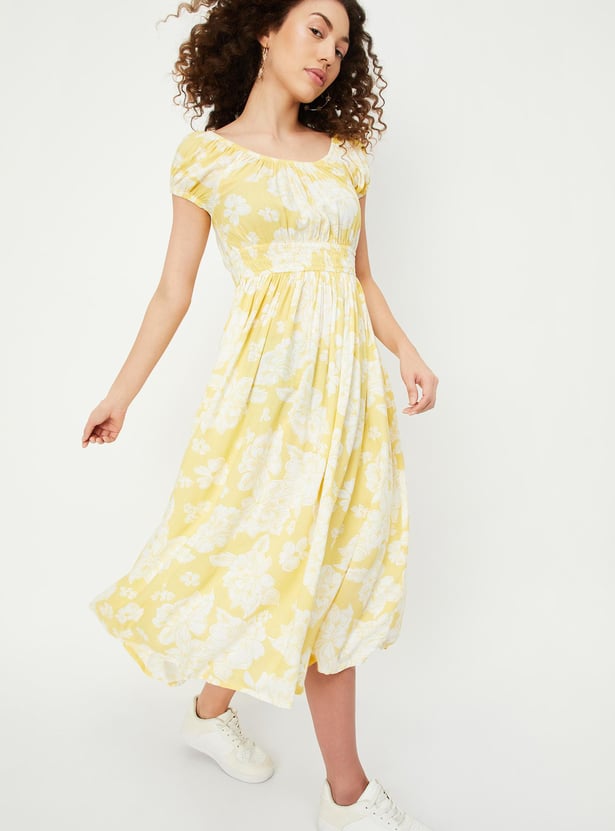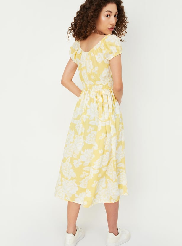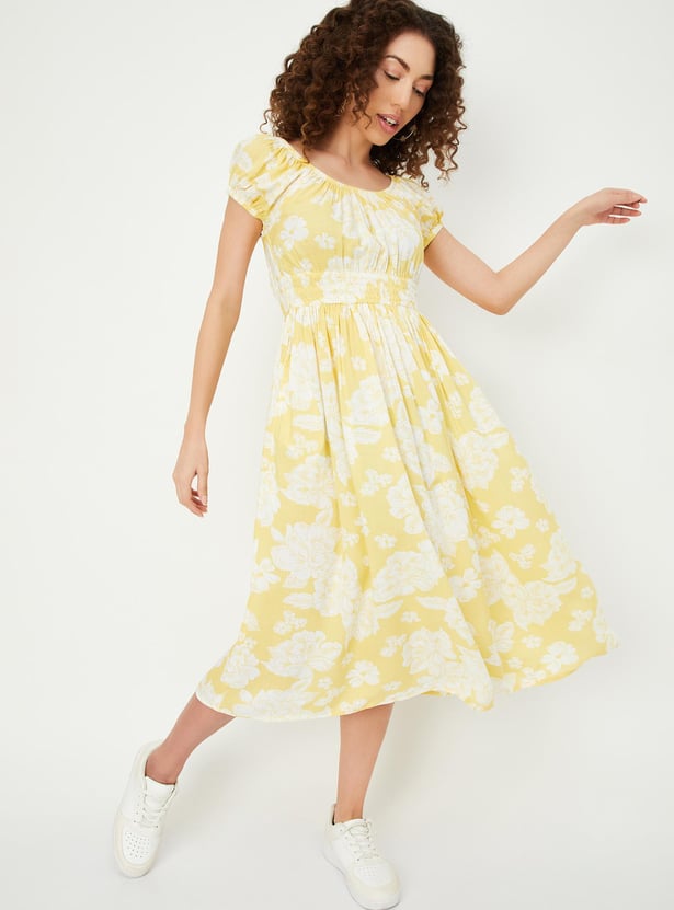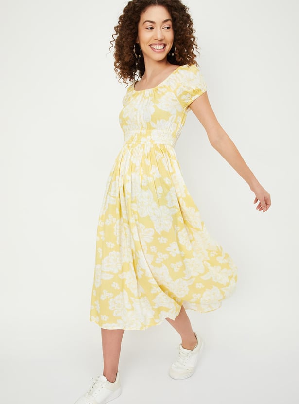 Elevate your wardrobe with this striking fit-and-flare dress, updated with floral prints. Featuring a round neck, puffed sleeves, an elasticated waist, and a midi-length profile, it exudes elegance and charm.