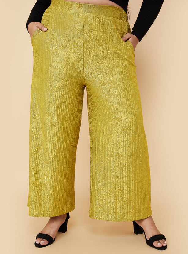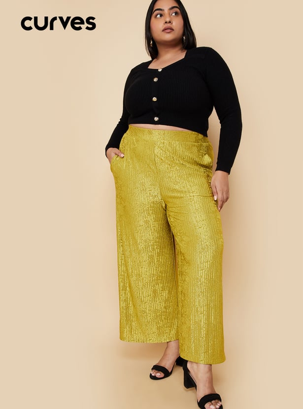 Add a touch of glamour to your wardrobe with these patterned shimmer wide-leg trousers. The elasticated waistband ensures a comfortable fit, while the two inset pockets offer practicality. The wide-leg design provides a flowy, elegant silhouette, perfect for both casual and dressy occasions. The shimmering pattern adds a stylish twist, making these trousers a standout choice for any outfit.