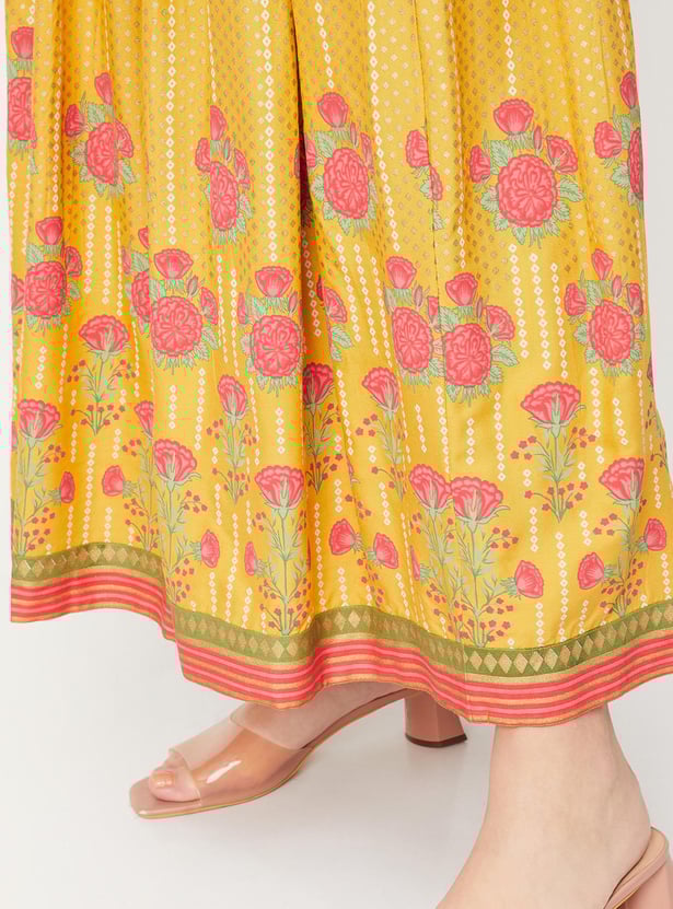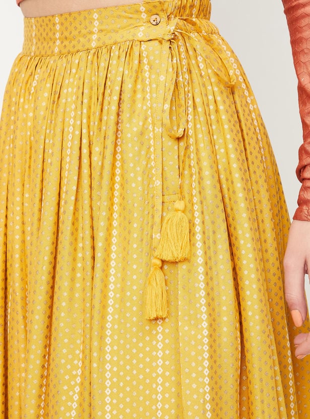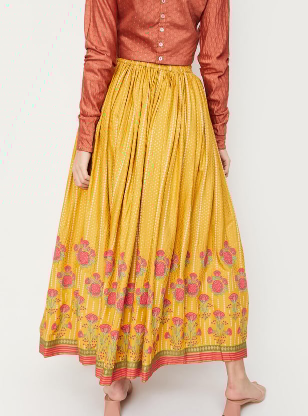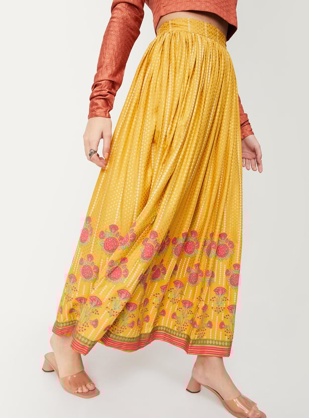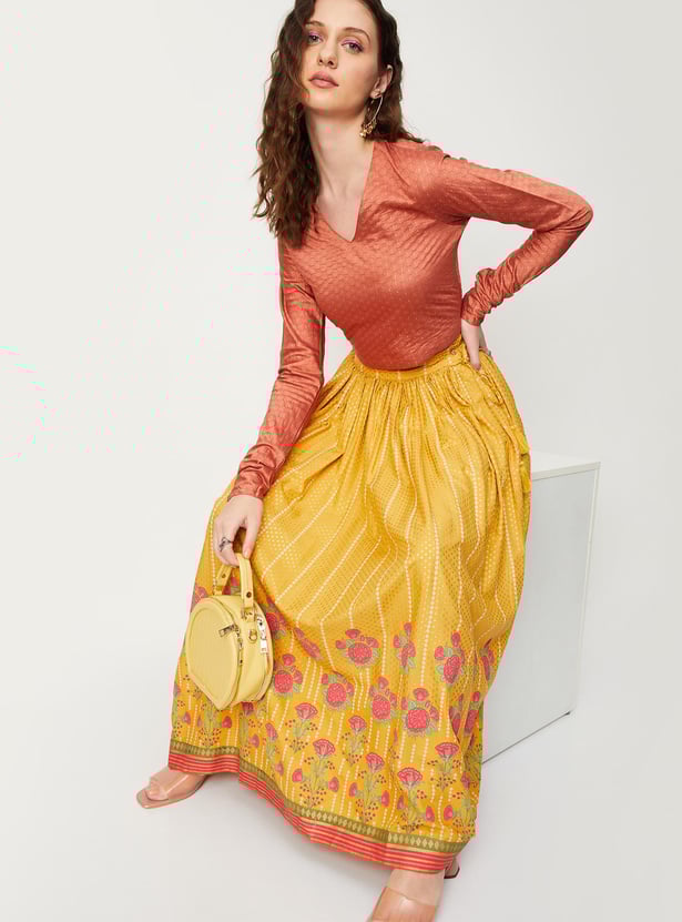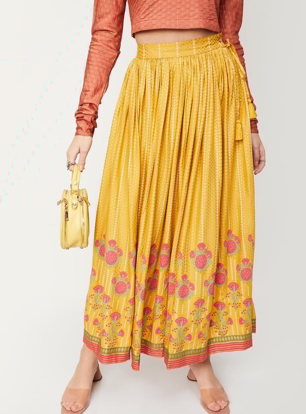 Breeze through the day in style. This maxi-length skirt is designed with floral and ethnic prints to exude an elegant look. It features a partially elasticated waist, tie-up with tassels, button closure, and an A-line profile. For a chic look, style this skirt with a contrasting top and heels.