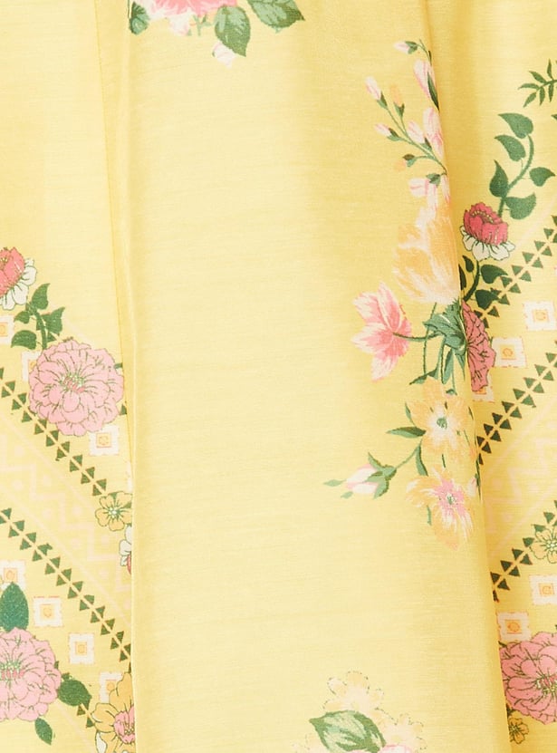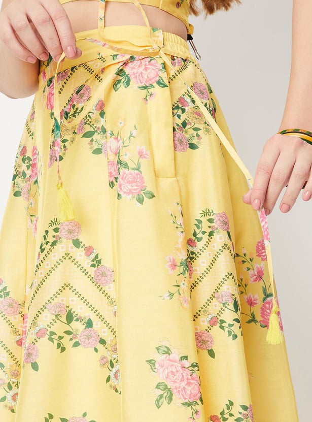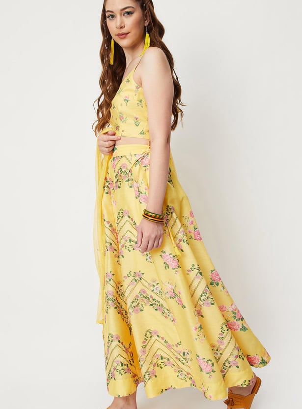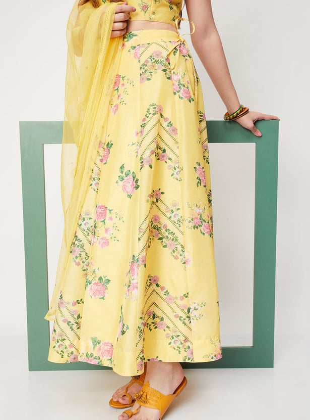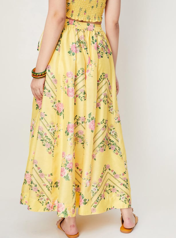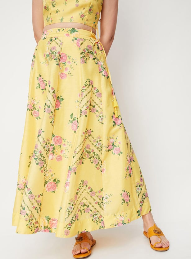 Nothing says elegant like this maxi skirt adorned with floral prints all over. It features a partially elasticated waist, a side tie-up with button closure, and a panelled design. Dress up your outfit by styling this skirt with a matching top and dupatta and finish the look with a pair of flat sandals.