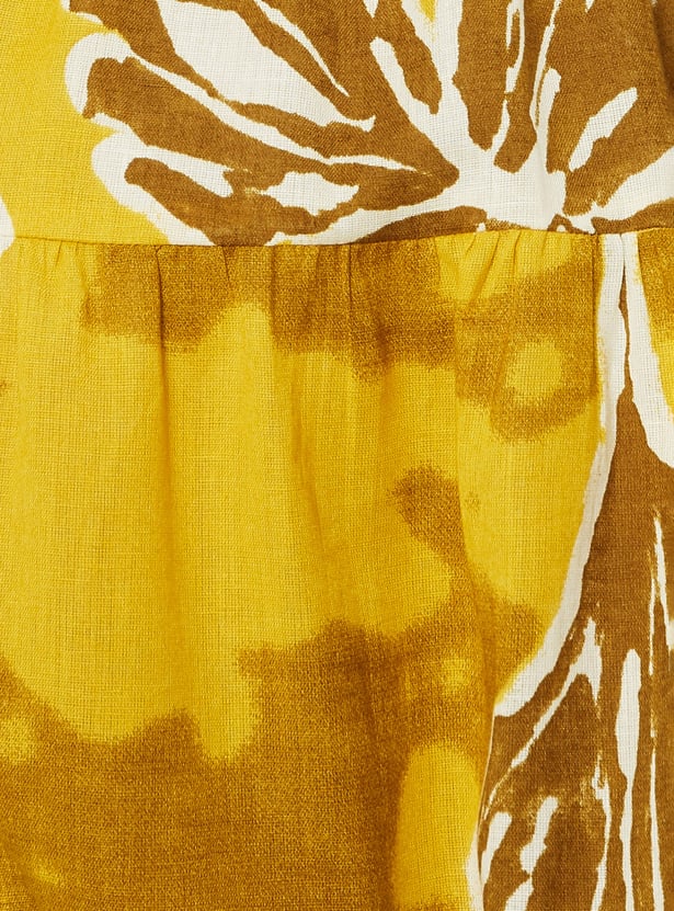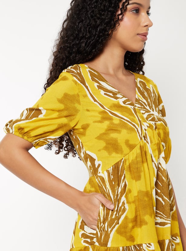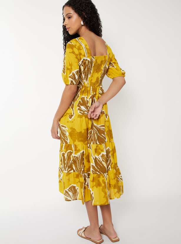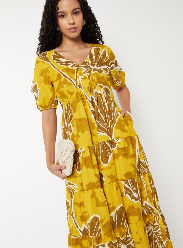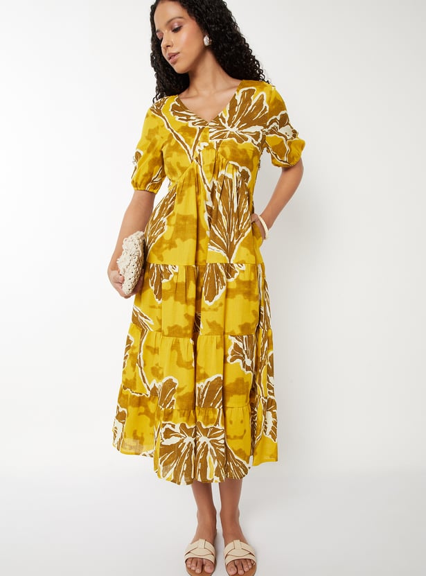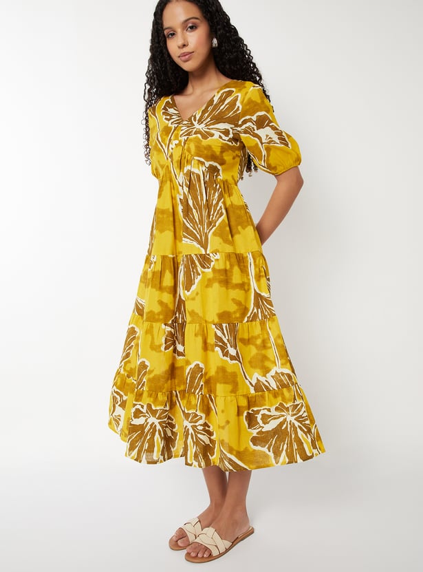 Step out in effortless styles, smocked with this printed tiered midi dress, featuring a flattering V-neck, side pockets. and half sleeves. The tiered silhouette adds soft movement and charm to your everyday look.