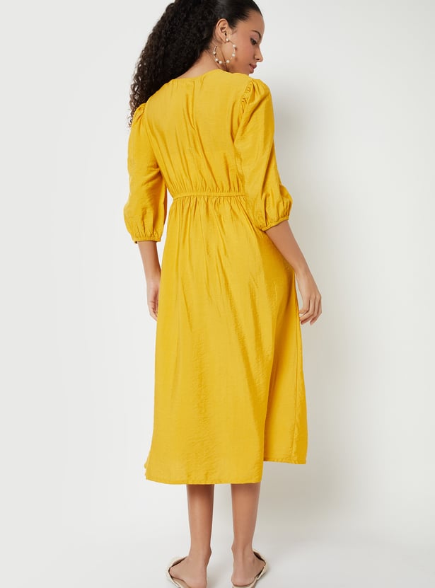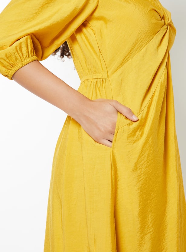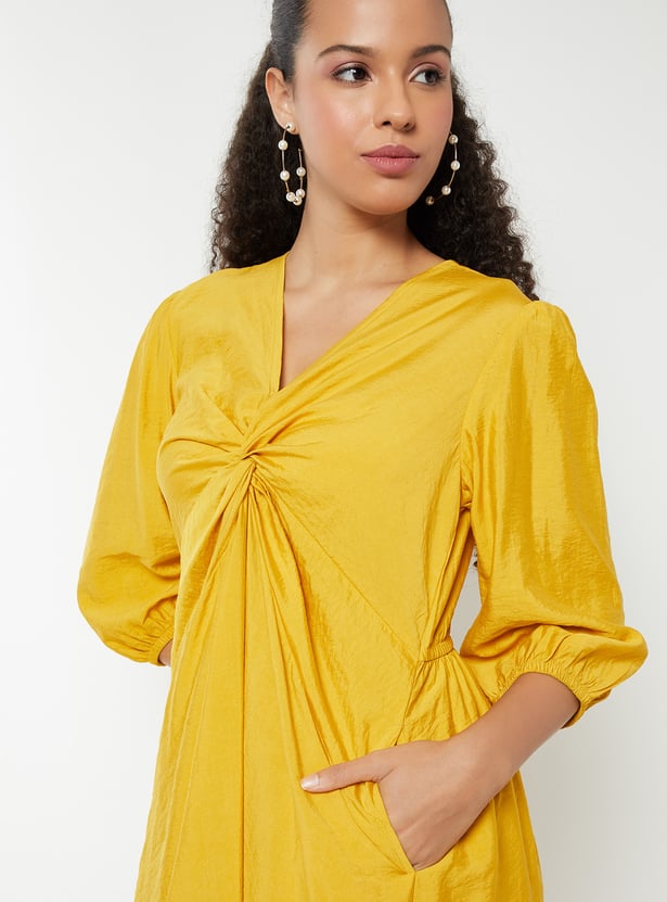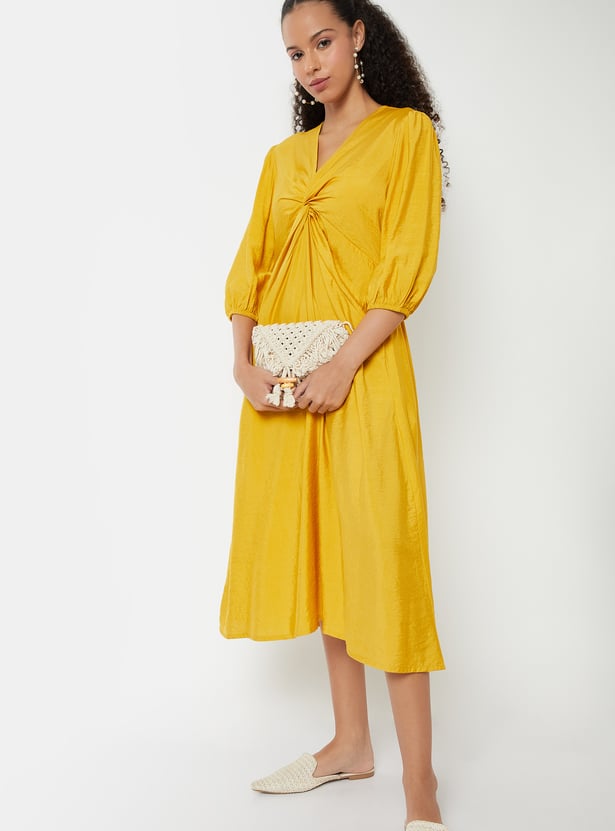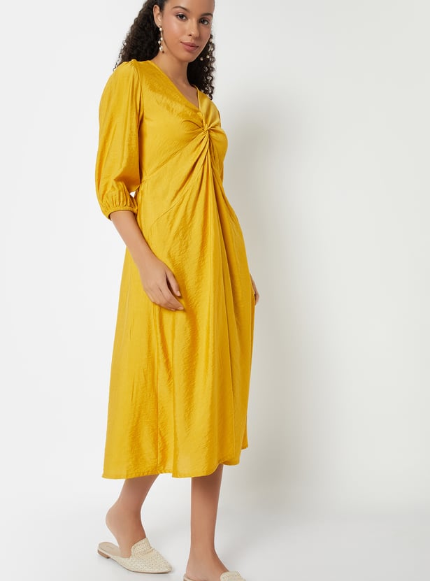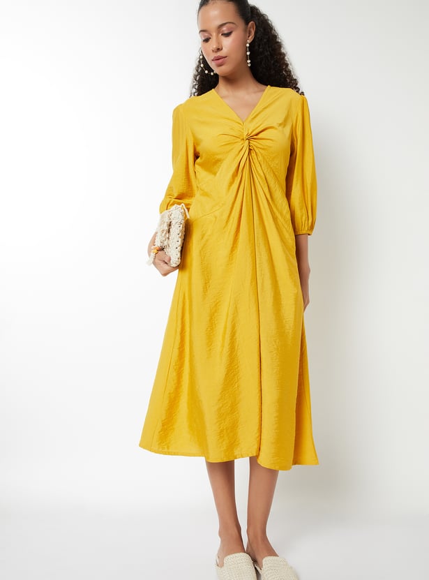 Turn heads with this textured knotted dress, designed with a flattering V-neck, elegant 3/4th sleeves, and a stylish midi length. The twist detail adds a modern touch to the textured fabric, making it a perfect blend of comfort and sophistication.