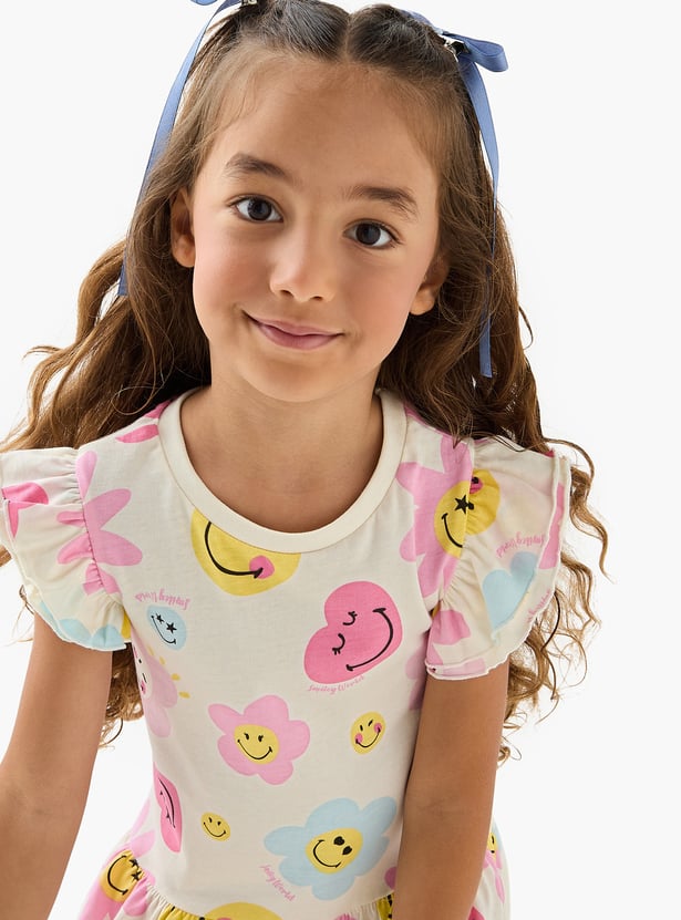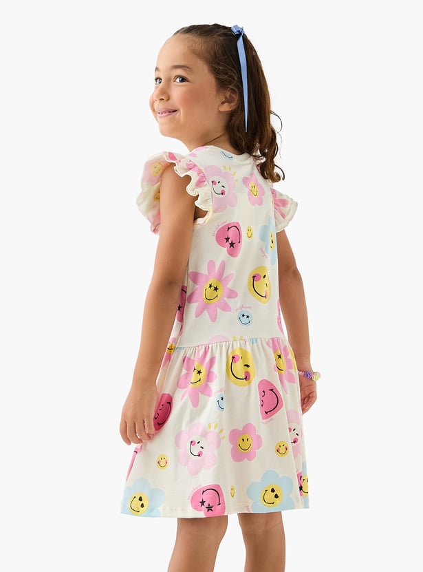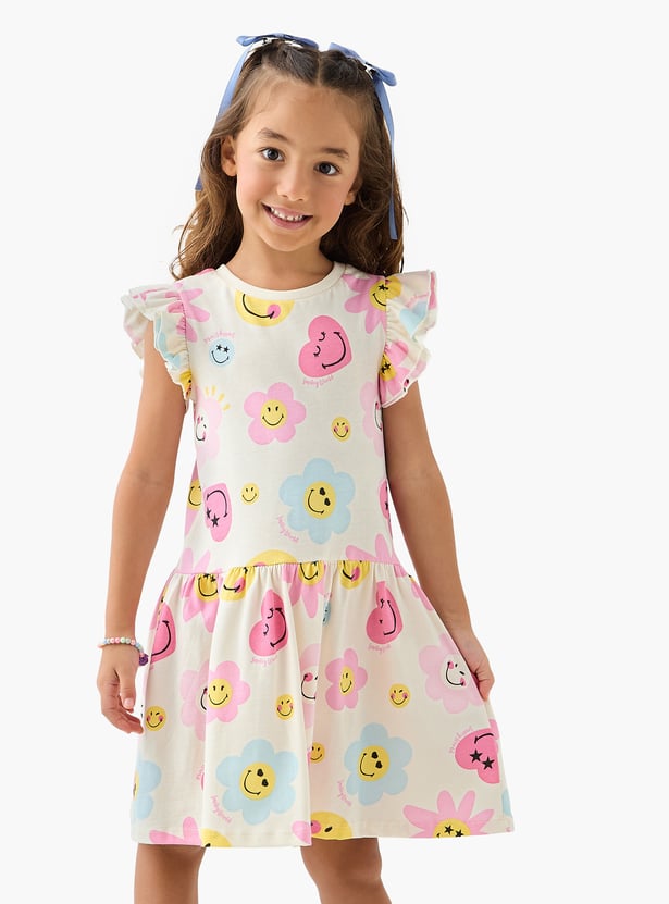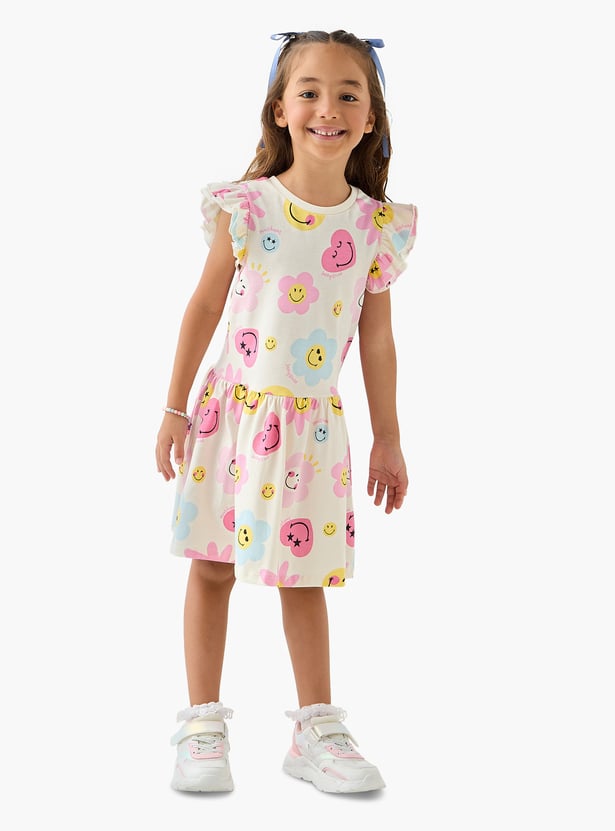 Add cheerful charm to your toddler girl's wardrobe with this dress. Made from soft fabric, it ensures lightweight comfort for warm-weather days. The dress features playful ruffled armholes and a drop waist silhouette for added style. An all-over Smiley World print adds a fun and lively touch. Perfect for casual outings and everyday wear with a joyful flair.